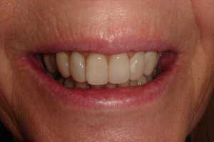 Example 24: Replacing two Porcelain Crowns with Composite Crowns including one Gumlift and one ‘Gumdrop’ with pink Composite
